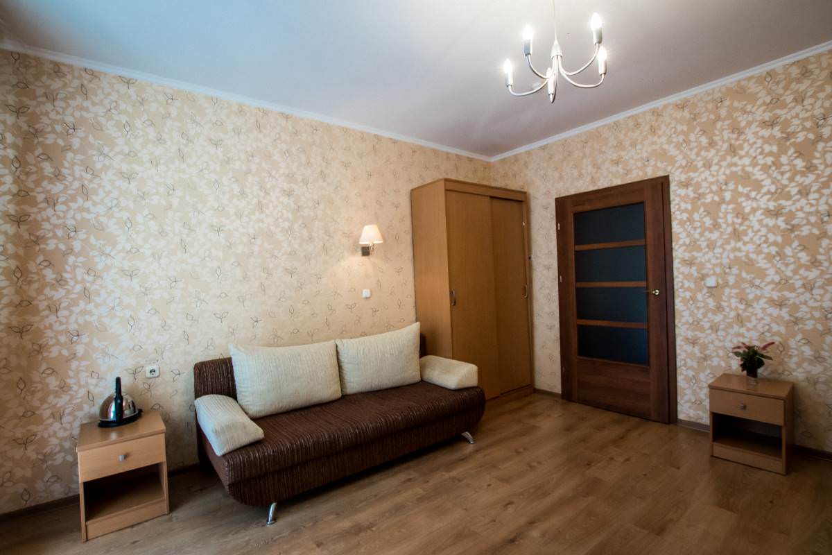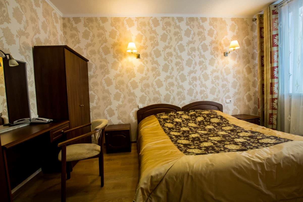 Площадь номера - 38 кв.м. 4 осн. места. 1 доп. место. Балкон. Мебель: вешалка, диван раскладной, зеркало, кровати односпальные /одна двуспальная кровать, прикроватные тумбочки, стол, столик туалетный, стулья, шкаф-купе. Оборудование: кондиционер, телевизор, холодильник, чайный набор посуды, электрочайник. Санузел: с ванной, туалетные принадлежности. Сервис: Wi-Fi бесплатно, смена полотенец, смена постельного белья, уборка номера.