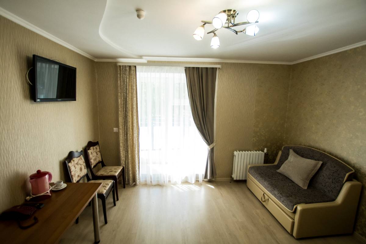 Площадь номера - 14 кв.м. 1 осн. место. 1 доп. место. Балкон. Мебель: вешалка, диван раскладной, зеркало, кровать односпальная, прикроватные тумбочки, стол, стулья, шкаф встроенный. Оборудование: кондиционер, мини-холодильник, телевизор ЖК, чайный набор посуды, электрочайник. Санузел: с душевой кабиной, туалетные принадлежности, фен. Сервис: Wi-Fi бесплатно, смена полотенец, смена постельного белья, уборка номера.