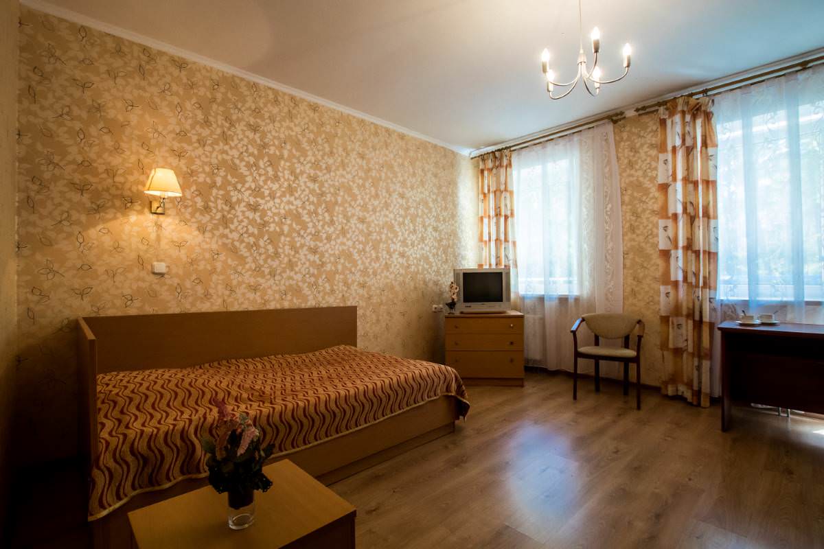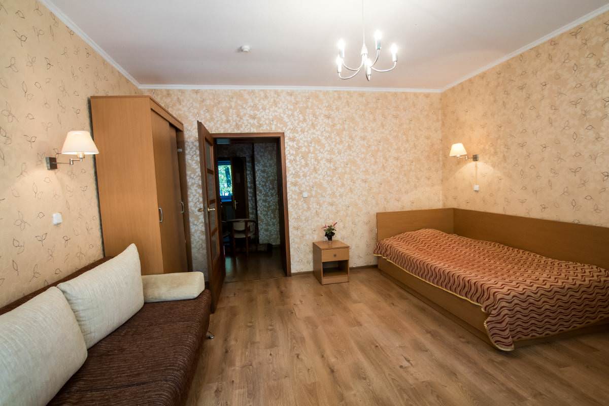 Площадь номера - 24 кв.м. 2 осн. места. 1 доп. место. Балкон. Мебель: вешалка, диван раскладной, зеркало, комод, кровать полутороспальная, прикроватные тумбочки, стол, стулья, шкаф встроенный. Оборудование: мини-холодильник, телевизор. Санузел: с ванной, туалетные принадлежности. Сервис: Wi-Fi бесплатно, смена полотенец, смена постельного белья, уборка номера.